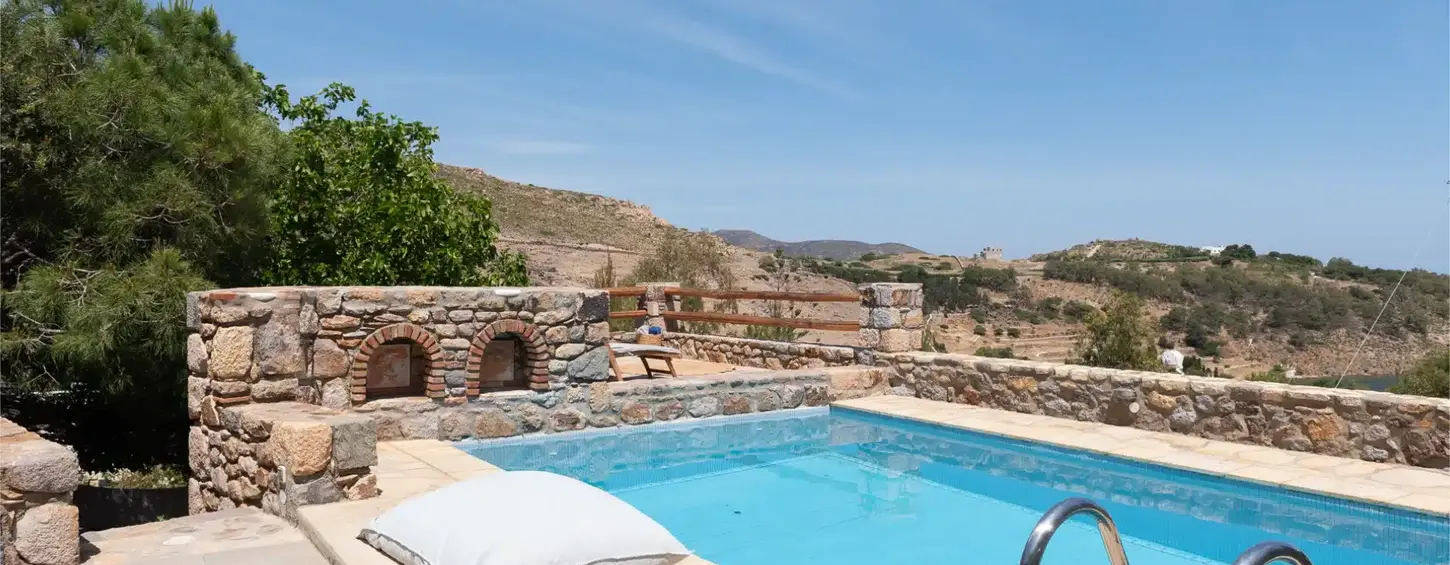 In the NE part of Villa Margarita, a smaller cozy studio is the ideal option for couples. The apartment has a double bed, bathroom and a small kitchenette while there is a big veranda which looks at Meloi beach as well as a private pool of 25tm. A small oasis of freshness invites you to dip into the clear water, perfectly relax under the sun of the Dodecanese, let your eyes travel into the wonderful sight of Patmos island and let yourself pampered by the revitalizing touch of the winds. Parking space is available as well. If you have been looking for “Patmos villas with pool” or “where to stay in Patmos”, then Blue Vista Patmos is your best choice for unique accommodation in the island!